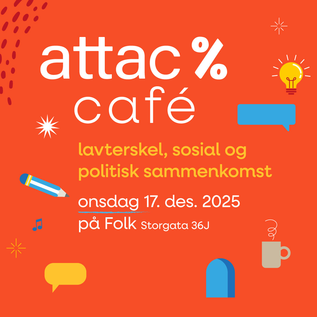 Attac-café er en sosial sammenkomst for alle som vil ha en mer rettferdig økonomi. Bli med oss for inspirerende og inkluderende samtaler rundt en kopp kaffe eller en øl. Her møtes vi for å bli kjent med hverandre, prate om de små og store spørsmålene og generelt hygge seg.