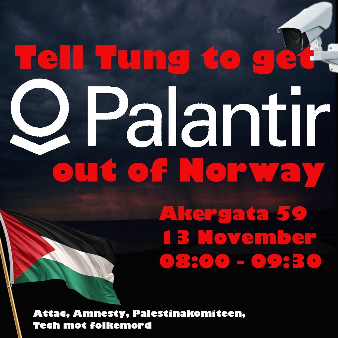 Mens digitaliseringsminister Karianne Tung møter Palantir, står vi sammen for å kreve at Norge slutter å samarbeide med selskaper som tjener på krig, okkupasjon og folkemord.