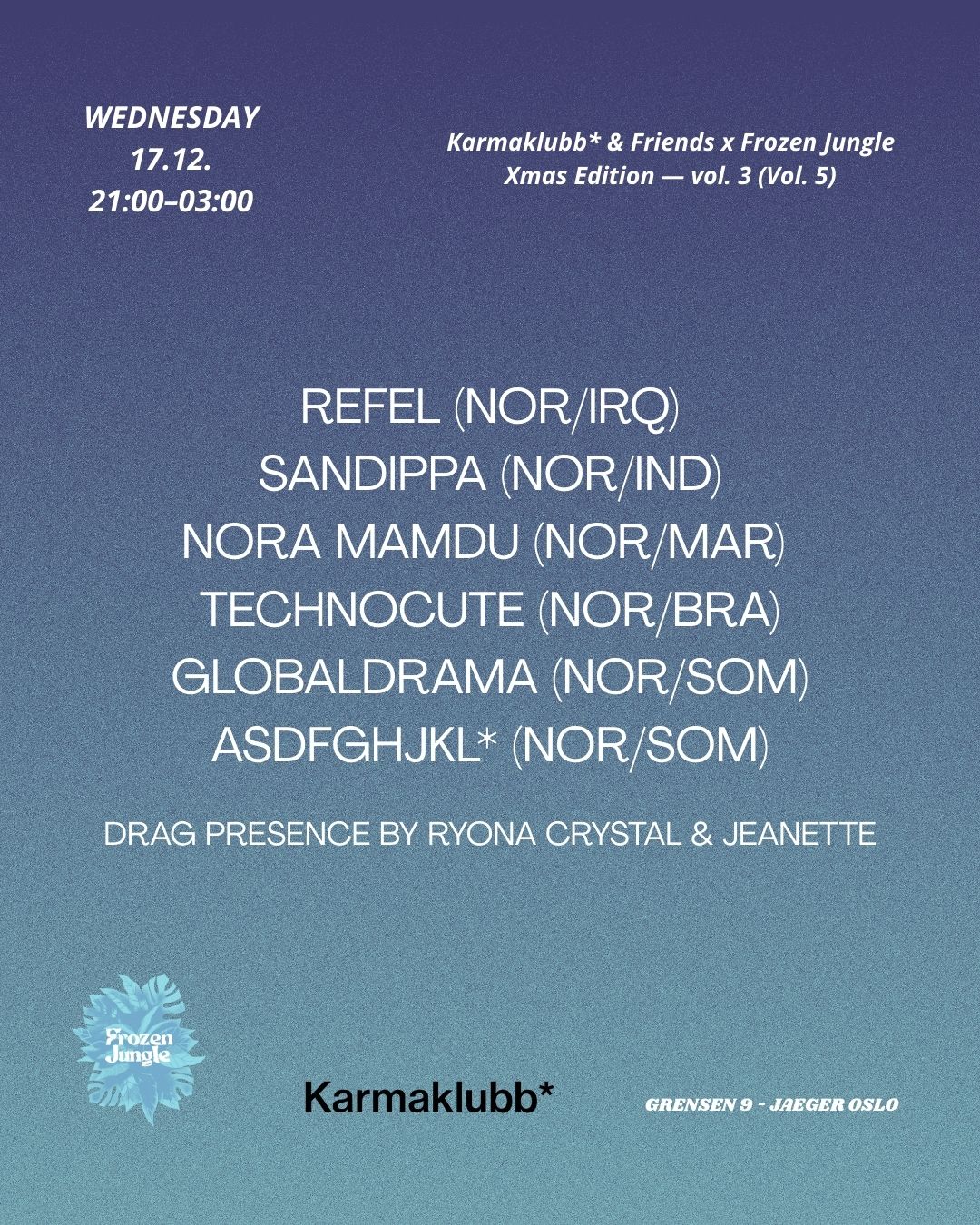 It’s a tradition: Last Wednesday pre Xmas, Frozen Jungle and Karmaklubb* gather at Oslo’s Jaeger for a full takeover.