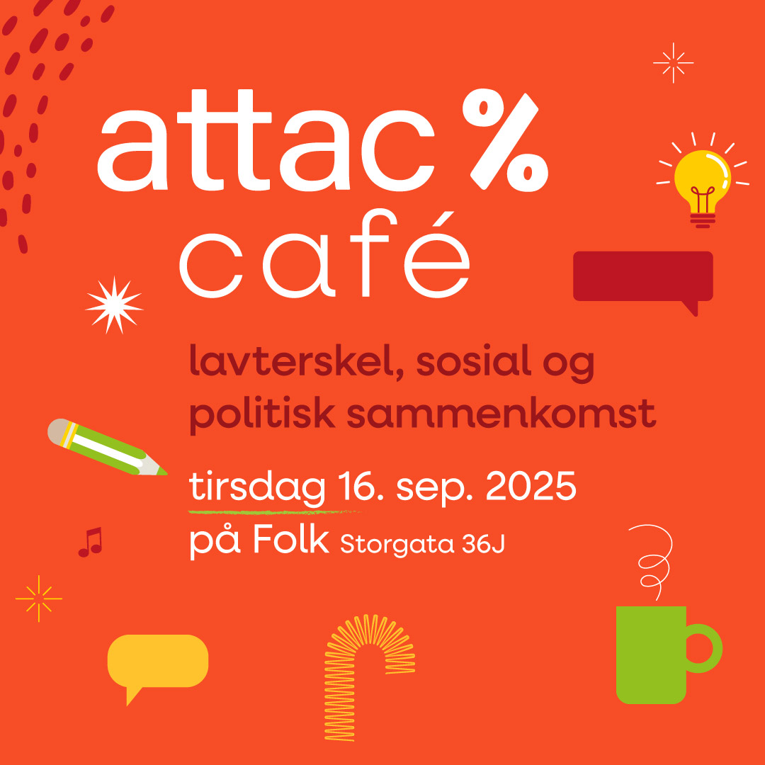 Attac-café er en sosial sammenkomst for alle som vil ha en mer rettferdig økonomi. Bli med oss for inspirerende og inkluderende samtaler rundt en kopp kaffe eller en øl.