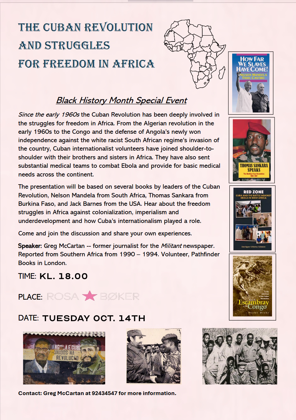 The presentation will be based on several books by leaders of the Cuban Revolution, Nelson Mandela from South Africa, Thomas Sankara from Burkina Faso, and Jack Barnes from the USA. Hear about the freedom struggles in Africa against colonialization, imperialism and underdevelopment and how Cuba’s internationalism played a role.